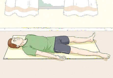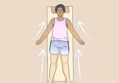 Get into the corpse pose. The corpse pose is one of the easiest poses you can perform, so it’s perfect if you’re just a beginner. Lie on your back and spread your legs so your feet are slightly wider than your shoulders. Keep your arms at your side with your palms face-up. Close your eyes and take a deep breath in through your nose. Exhale through your mouth and let your whole body relax. Take a few more deep breaths before getting out of the position. If your back feels uncomfortable in this position, bend your knees and put your feet flat on the floor.