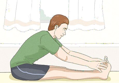Try a seated forward bend. Start by sitting on the floor with your back straight and your legs stretched out in front of you. As you inhale, raise your arms slowly above your head. When you exhale, bend forward at the hips. Keep your spine straight as you reach your hands toward your feet. Hold your position and keep taking deep breaths. With each exhale, try to bend even further down. You can hold this pose for anywhere between 5–20 breaths. If you feel tight in your hamstrings, sit on a folded blanket for some extra support. It’s okay if you aren’t able to reach your feet right away. Just try to walk your hands down your legs as far as you can.