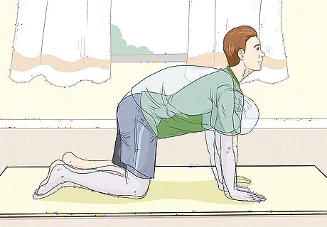 Perform the cat/cow poses. Kneel on the floor so your knees are directly below your hips and your hands are under your shoulders. Take a deep breath in and arch your lower back so your pelvis tilts up. Bring your head up so your chin points straight forward. When you exhale, bring your head down and round your lower back with your pelvis down. Alternate between these positions for a few deep breaths. If you have a neck injury, keep your head in line with your torso so you don’t hurt yourself.