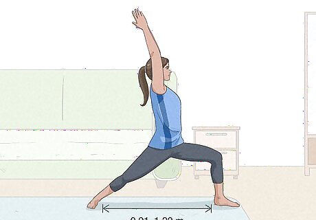 Stand in the warrior pose. Spread your feet about 3–4 feet (0.91–1.22 m) apart. Turn your left foot so it points to the left. Keep your right foot at a slight angle. Turn to the left at the hips so you’re looking forward. Bend your left leg so your knee stays above your ankle. Make sure your right leg stays straight. Raise your hands above your head with your palms facing in to get into the pose. Hold the position for a few breaths before switching sides. Do your best to keep your heels planted on the ground throughout this pose. If you need to, it’s okay to lift your back heel off the ground.