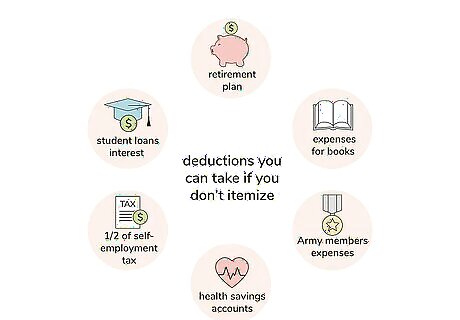 There is a long list of "above-the-line" deductions you can take. These are also known as "adjustments to income." You can take them to reduce your taxable income even if you take the standard deduction. Common above-the-line deductions include: Contributions to an IRA or other retirement plan Expenses for books and supplies incurred by teachers Expenses for Army Reserve members Health savings accounts Half of your self-employment tax, if you're self-employed Interest on student loans