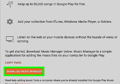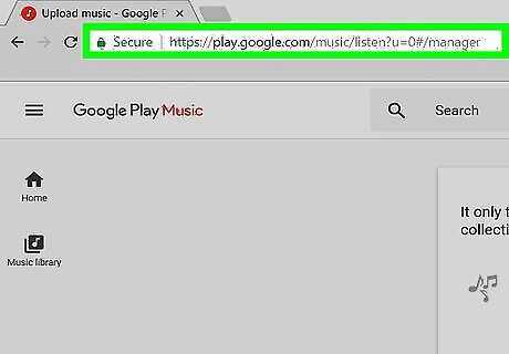 Go to [https://play.google.com/music/listen?u=0#/manager the Music Manager page in a web browser. Open a web browser and go to https://play.google.com/music/listen?u=0#/manager to download the Music Manager.