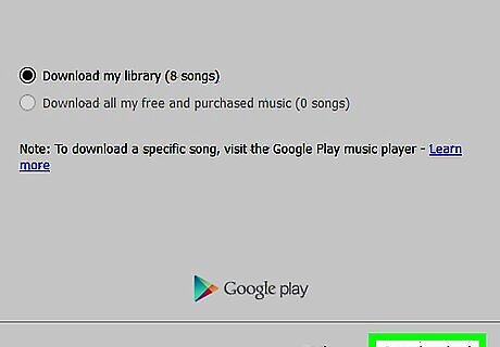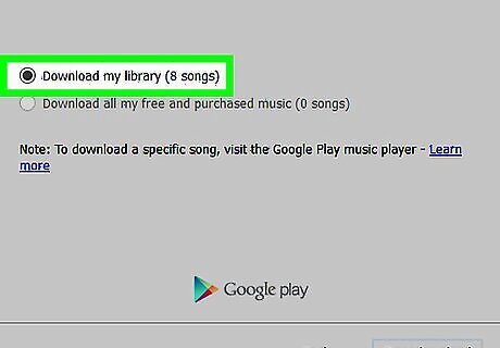 Select what music you want to download. Click the radio button for "Download my library" to download everything you own including music you've uploaded, or you can click the radio button for "Download all my free and purchased music" to download just the songs you've purchased or received for free on Google Play.