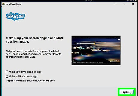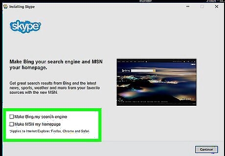 Opt out of Bing and MSN. If you don't want Skype to change your browsers to use Bing and MSN as their search engines and home pages, respectively, uncheck both boxes in the bottom-left side of the window before proceeding.