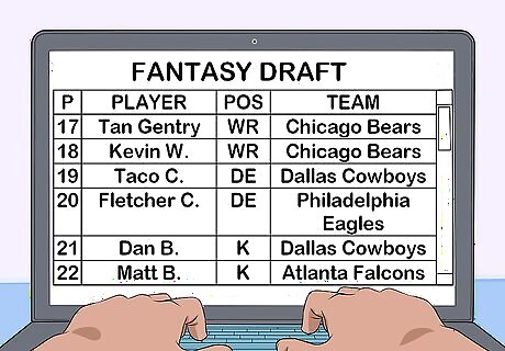 Wait on kickers and defense until the very end of your draft. Kicker and defense point totals can fluctuate heavily throughout the season, so it’s not worth it to use an early- or mid-round pick on one of these positions. They’re also typically low scorers that are hard to predict before the season begins, so there’s not much reward in picking up an elite kicker early.