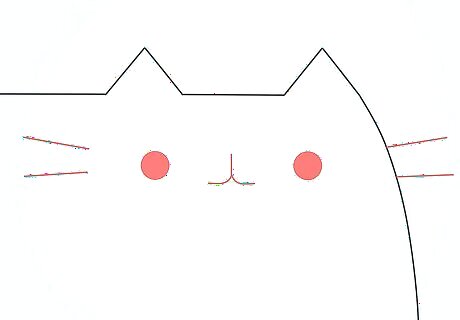 Draw the face of Pusheen. Draw two dots for her eyes. Draw her mouth by drawing a line that splits into two and curve it upward. Draw the whiskers by drawing two lines on each side.