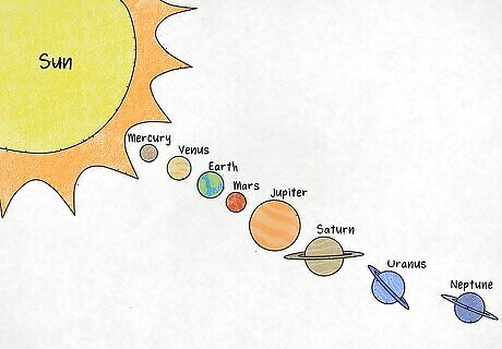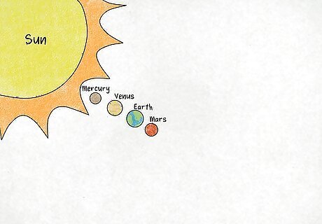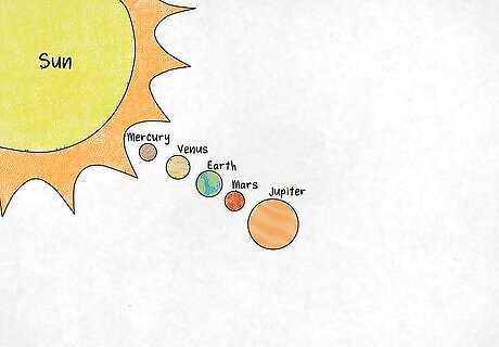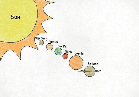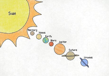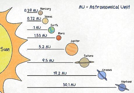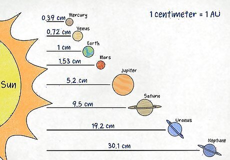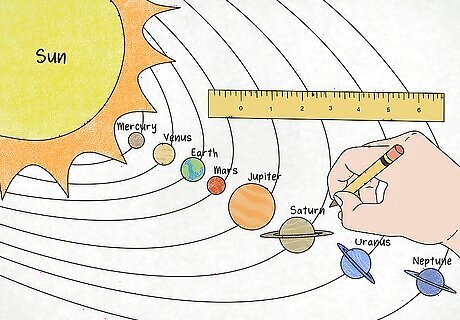 Use the scaled-down distances to draw the solar system to scale. Start by drawing the Sun on a piece of paper. Then, measure and mark the scaled-down distances from the sun for each planet using a ruler. When you’re finished, draw the planets over the marks you made. Write down the scale you used somewhere on your drawing so it’s clear how far apart the planets are.