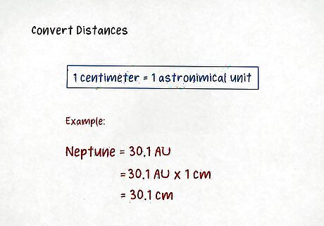 Convert all of the distances using your scale. To convert the distances, multiply each distance in AU by the number before the new unit. Then, write down the distance with the new unit. For example, if your scale is 1 centimeter = 1 AU, you would multiply each distance by 1 to convert them. Therefore, since Neptune is 30.1 AU away from the sun, it would be 30.1 centimeters away in your drawing.