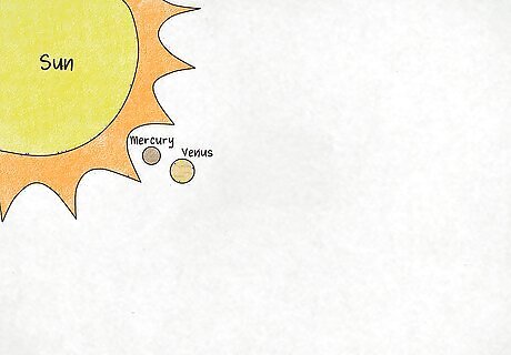 Sketch a larger circle to the right of Mercury for Venus. Venus is the second closest planet to the Sun, and it’s bigger than Mercury. Color in Venus with different shades of yellow and brown. Venus gets its yellowish-brown color from the clouds of sulfur dioxide that cover its surface. However, if you were able to travel through the clouds and look at the actual surface of the planet, it would look brownish-red.