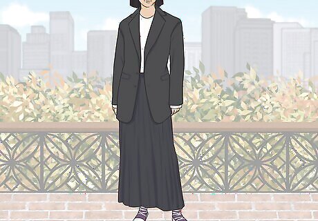 Blazer Babe Fall Outfit Style your favorite black blazer for fall with an oversized option layered over an equally-oversized black maxi skirt. Wear a cream-colored, long-sleeve shirt underneath. Add a pair of shades and ankle tie flats that match the color of your undershirt, then add a pair of socks in an autumnal shade for a pop of color—we recommend sage green, eggplant purple, or pumpkin orange.