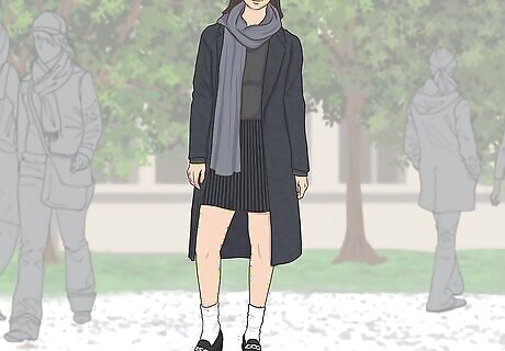 Pleated Mini-Skirt Fall Outfit Don’t pack away your summer skirts just yet! Try this autumn-appropriate look with a pinstriped and pleated mini skirt in a neutral hue. Warm yourself up by draping the rest of your body in a cashmere sweater, long scarf, and woolen trench coat. Lastly, slip on a pair of cozy socks and chic loafers.