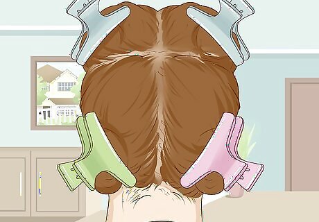 Divide your hair into 4 sections. Run a comb down down your middle parting to separate your hair into 2 sections. Divide each section of hair in half horizontally so that you have 4 sections of hair in total. This will make it easier to saturate all of the hair with dye. Secure each section with a hair tie or clip. Unclip each section before you dye it, then brush or comb each section.