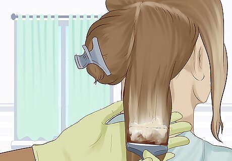 Continue applying the dye section by section. Unclip the other front section and brush out your hair. Then, paint 1 inch (2.5 cm) sections of your hair with the dye until all of the hair on the front of your head is saturated. When you've finished with the front of your hair, remove the ties or clips from 1 of the back sections and repeat the process. Finish by applying dye to the last section and ensure that each strand is evenly coated with dye to ensure a rich, even color. It normally takes around 1 hour to apply the dye. If you have very thick or long hair, it may take a bit longer. If you are dying your hair by yourself, use mirrors to help you see the back of your head. Place a portable mirror opposite the bathroom mirror and look in the portable mirror to see a reflection of the back of your head. This will help you to see any spots that you have missed. As an alternative, ask a friend or relative to help you.