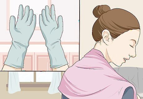 Wear old clothes and gloves to protect yourself from the dye. Dye looks great in your hair but not so much on skin or clothes! Put on an old shirt that you don’t mind getting stained as applying dye is a messy process. Wrap an old towel or scarf around your neck to protect it from drops of dye and wear disposable gloves to stop the dye from staining your fingers brown. Spread a thin layer of petroleum jelly around your hairline, ears, and neck to prevent the dye from staining your skin.