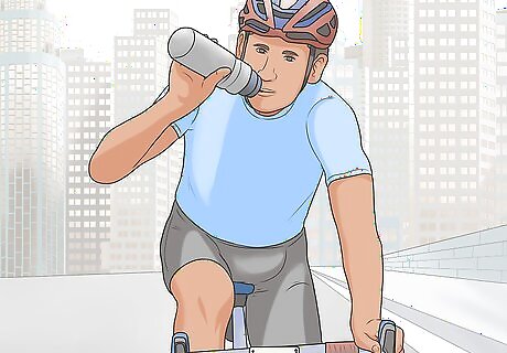 Drink water every time you take a gel. Water will help you to swallow and digest the energy gel, especially if it’s a thicker consistency. Take a few swigs of water after you eat each gel during the race. Aim to consume about 0.6–1 L (20–34 fl oz) of water per hour during the race. If sports drinks are offered at the hydration stations, you can also drink one of these in place of water and a gel. You might want to do this if you don’t think your stomach can handle another gel, such as towards the end of a race.