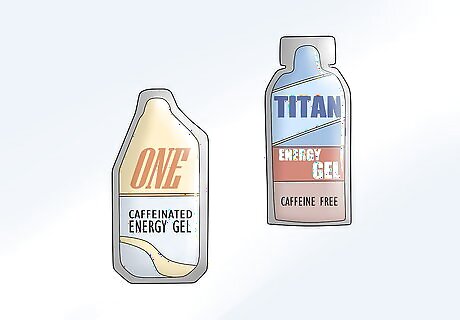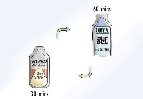 Alternate between caffeinated and caffeine-free gels during the race. Too much caffeine can dehydrate you and make you feel nervous, so it’s important to avoid taking too much of it. If you want to use gels that contain caffeine to boost your performance, switch back and forth between caffeinated and caffeine-free gels during the race. For example, if you take a caffeinated gel 30 minutes into the race, take a caffeine-free gel at the 60-minute mark, then take another caffeinated gel at the 90-minute mark.