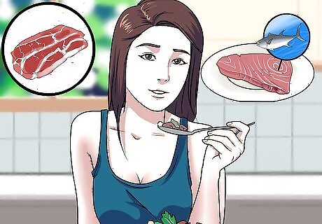 Eat protein with carbohydrates. Even when eating low-glycemic foods, you should combine those foods with low-fat proteins such as fish. This combination helps you feel fuller longer and lowers the GI for the meal.