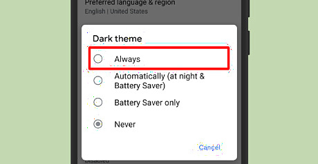 Enable the dark theme. Select Always from the dialog box to turn on the dark theme. You can also schedule the dark theme for night time. If you want to automatically enable the dark theme when battery saver is turned on, tap on “Battery Saver Only” from the Dark theme settings.