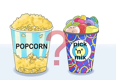 Pick out what you are going to eat (if you'd like) while watching the movie. You don't have to eat, but it's sometimes fun to break out the popcorn or pick 'n' mix. Only choose one of the options, because it can be uncomfortable being full and trying to focus on a film at the same time. You could go for a meal before, but that means that you probably shouldn't eat everything at the cinema. Make sure that what you are eating is what you want to eat because if the food is absolutely horrific then no one will be very pleased. If you're an indecisive person and are travelling with a group you should make the decision a few hours before to stop the rest of the group from getting bored, agitated or angry from waiting too long.