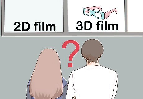 Decide between 2D and 3D films. Although some 2D movies have been made for 3D now, 3D will generally be more expensive, can make some people feel sick, not to mention the glasses making your nose feel funny and being just not the right size. With a group, see who doesn't like 3D. If even one person says they don't like 3D then go and see 2D instead. You don't want them vomiting in the middle of all the seats. If you have decided to see 3D, then remind everyone to take their own glasses.