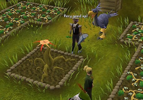 Get seeds. There are several ways to do this, depending on the kind of seeds you want. Many mid to high leveled monsters drop higher seeds (for example herbs) while the lowest kinds (such as potatoes) can be gained from seed shops. Thieving master farmers or simply buying them at the Grand Exchange are always a great deal.