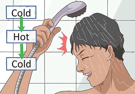Try a cold/hot/cold shower. One surefire way to wake yourself up in the mornings it to take a shower of varying temperatures to shock yourself awake. Begin by using cold water for a minute or two, then hot water, and then finishing off with cold water. If you cannot handle the water being cold or hot, try it as cool and warm, instead.