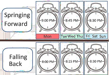 Get ready a few days in advance. You will feel more able to cope with the time change if you prepare for it. Begin adjusting your sleep schedule in advance depending on if the clock is springing forward or falling back. If the former, begin going to bed 15 minutes earlier for three days prior to the time change and then another 15 minutes earlier on the day of. If falling back, do the opposite by going to bed 15 minutes later for a few days. Making small adjustments early will help to ease the transition of the time change. Start making small adjustments to your mealtimes in the days leading up to the time change. Perhaps adjust the start time by ten minutes each day to help your body adjust to the change.