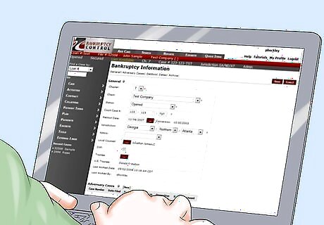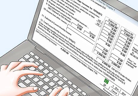Complete your required bankruptcy paperwork. This will prove to be your most time-consuming step. If you have the resources, you would probably be better off buying a bankruptcy software program to assist you. If you do not use individual-bankruptcy software, you may encounter problems with truncated data, manual submission of repetitive data, multiple manual mathematical calculations, and conflicting legal interpretations of state and federal bankruptcy law. Click here to access copies of all of the different bankruptcy forms that you must complete and file.