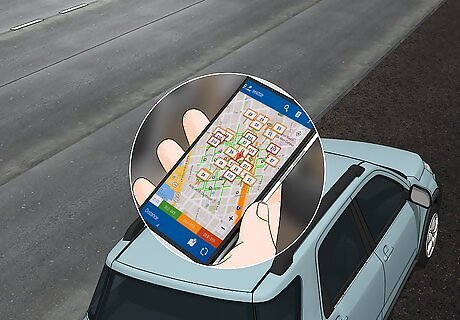 Pull over to the side of the road to use your mobile app. Once you have come to a stop in a safe position, grab your smart phone. Open the mobile app that you use to find parking. See where you have to drive to find a spot. Head to the spot and safely park your vehicle.