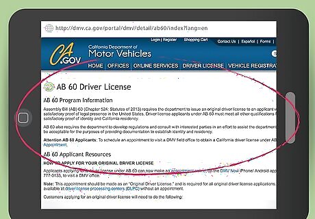 Locate your state requirements. Each state issues its own driver’s license. Accordingly, the requirements for each state may differ slightly. To find out your specific requirements, locate your state’s Department of Motor Vehicles (DMV) website, which should have a list of requirements. To find your state’s DMV, type “DMV” and your state into a search engine. Then find the requirements for a driver’s license. Pay attention only to your state’s requirements.