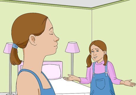 Try to stay calm. If you lose your cool, the fight will escalate out of control. First, take a deep breath and count to ten. If you can’t relax, leave and come back later. Once you’ve calmed down, being nice to your sister will help keep you composed. For example: Speak calmly and respectfully even if you’re upset. Resist the urge to hit or push your sister. Listen to everything your sister says and think about her words.