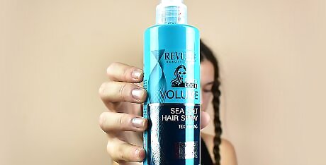 Spritz your hair with a volumizing spray. Apply a few spritzes of volumizing spray to your hair, focusing mainly on the roots. Hold the spray about 6 inches (15 cm) away from your hair, and be sure not to apply too much or your hair could look flat and oily instead of voluminous. You can help protect your hair by purchasing a spray that also protects from heat. Many manufacturers make sprays that are both volumizing and heat-protecting, so just read the labels and choose one that does both. If you have dry/damaged hair, choose a volumizing spray that also moisturizes the hair. Look for the words “moisturizing” or “protective” on the packaging.