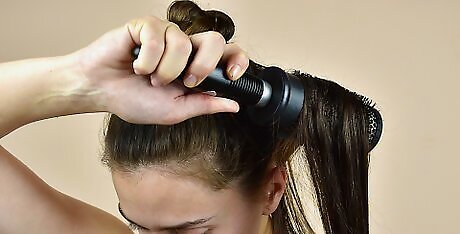 Hold your hair up and out while blow-drying. Once your hair is in the round brush, lift the brush slightly upwards, in the opposite direction of hair growth. Holding it this way as you blow-dry your hair will improve your hair’s volume by locking it in a position that is up and away from your scalp.