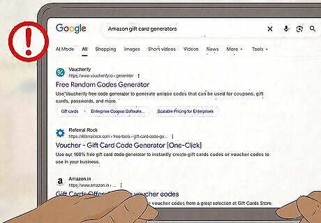 Avoid Amazon gift card generators. Several websites claim to generate usable Amazon gift card numbers. Most, if not all, of these generators are scams. They typically require you to download an app and share personal information, which can be used to infect your device with malware (such as keyloggers) or steal your personal data. Even if you do manage to generate a gift card this way–which is unlikely–you could get into trouble with Amazon if you get caught.