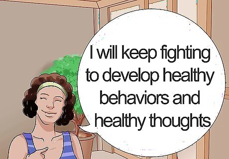 Change your negative self-talk to positive and productive affirmations. Your therapist will likely teach you how to catch negative self-talk and challenge it with self-compassion. If you find yourself having an internal dialogue that includes negative put-downs or self-bullying, notice these and then express kindness to yourself. For example, if you tell yourself, “I’m so stupid and ugly. I know everyone hates me,” acknowledge that you had that thought. Remind yourself that it is a thought, not a fact. Then, present a self-compassionate alternative: “I just caught myself having an abusive thought toward myself. I'm working on being kinder to myself, and those thoughts aren't helpful for achieving that goal. I am learning every day how to have a healthier relationship with food and myself. I will keep fighting to develop healthy behaviors and healthy thoughts."