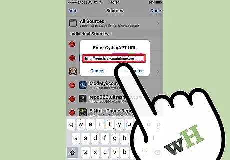 Tap on “Add,” then type “www.repo.hackyouriphone.org” into the URL field. This allows Cydia to install apps from the Hack Your iPhone source. Alternately, you can type “ihackstore.com/repo/” into the URL field if you prefer to install iFile from iHackStore.