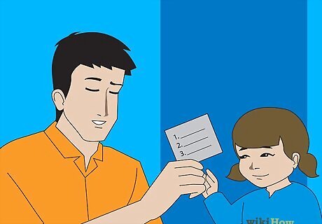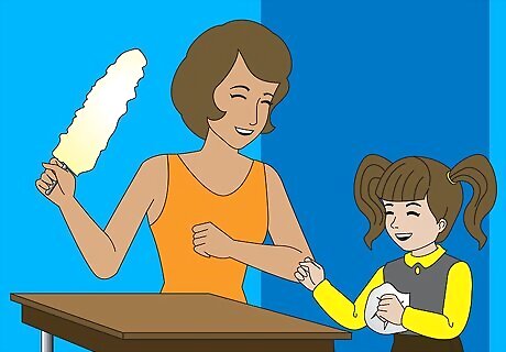Give them a series of small tasks instead of one large job. Engage children in small tasks related to putting their toys away at first, to build the foundations for doing chores. Show your child where their toys go and tell them to put the toy there when they're finished with it. It's easier to teach a child to put away a toy after using it, than to teach a child to clean up a room that's become a total disaster area. Make sure you have a specific place for everything. If your child doesn't know where something goes, it will be hard to clean. Create special bins for stuffed animals, Legos or doll clothes, for example, and help small children understand that there is a place where their toys can rest when not being used. A token system can be extremely useful in motivating your child to do chores. For example, you could give them five tokens for doing a small task. After earning enough tokens, the kid can use a tablet or the TV for five more minutes. Molding the desired behaviors gradually will help you teach your children to do tasks on their own over time.