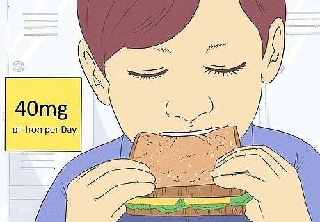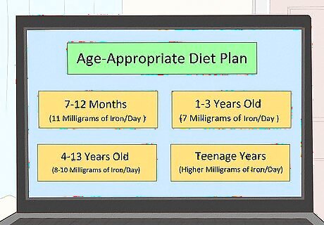 Create an age-appropriate diet plan. Newborns to six month olds rarely need additional iron supplements if they are breast feeding or taking iron-fortified formula. Speak with your pediatrician to find out if supplements are necessary for your child. As your child gets older, his dietary requirements will change, so remember to adjust his diet. Babies between the ages of seven and 12 months require 11 milligrams of iron per day. Children between one and three years old require seven milligrams of iron per day. Children between four and 13 years old require between eight and 10 milligrams per day. Requirements rise as children enter the teenage years.