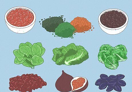 Get non-heme iron from plant sources. Though these are not as easily absorbed by the body, they contain iron and should be consumed for other reasons. Provide your child with plenty of beans and legumes, as well as fresh iron-rich vegetables and dried fruits. Cereals can be extremely iron-rich. Plant sources are an important part of a healthy diet and are easily added to any recipe. Popular iron-rich beans include soybeans, lentils, kidney beans, black beans, pinto beans, and garbanzo beans. Vegetables that are high in non-heme iron include yellow peppers, broccoli, Brussels sprouts, artichokes, tomatoes and leafy green vegetables, such as kale and spinach. Most fruits are not high in iron; however, dried fruits, prunes, raisins, and figs are a good source of non-heme iron.