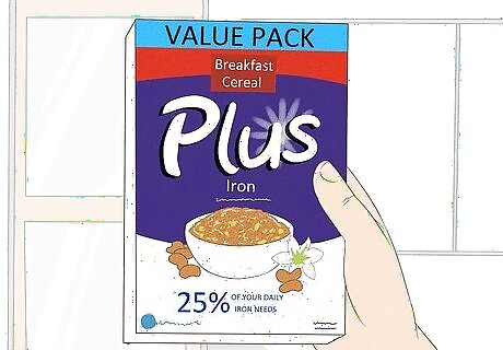 Choose healthier breakfast cereals. Replace high-sugar cereals that have very little nutritional value with healthy, iron-fortified cereals. Check the labels on ready-to-eat cereals and choose one that provides a significant amount of your child's recommend daily iron allowance. Oatmeal and cream-of-wheat are also very high in non-heme iron.