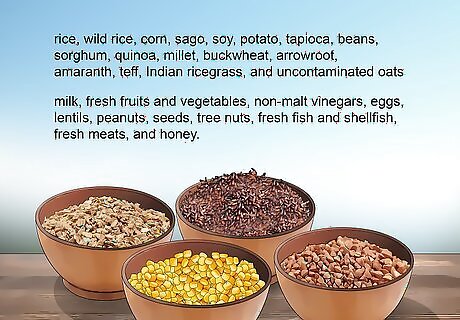 Memorize your “go-to” and “must avoid” foods. Once you commit to a gluten-free lifestyle, you’ll quickly learn which foods and ingredients you can have and which you must avoid. The sooner you master these lists, the easier (and more cost effective) your grocery shopping will be. GF grains include rice, wild rice, corn, sago, soy, potato, tapioca, beans, sorghum, quinoa, millet, buckwheat, arrowroot, amaranth, teff, Indian ricegrass, and uncontaminated oats (labeled as gluten-free oats). Other GF foods include (but aren’t limited to) milk, fresh fruits and vegetables, non-malt vinegars, eggs, lentils, peanuts, seeds, tree nuts, fresh fish and shellfish, fresh meats, and honey. Foods to avoid contain wheat (including einkorn, durum, farro, graham, Kamut, semolina, spelt), rye, barley (including malt products), and triticale.