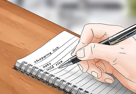 Write a specific shopping list and don’t deviate from it. Once you’ve come up with your weekly menu, write down exactly what you need to get, including the amounts. Remind yourself and anyone shopping with you that your job is to buy exactly what’s on the list and nothing more. Some grocers now offer online ordering and curbside pickup, which may make it easier for you to limit yourself to buying only what you need on your list. Don’t grocery shop when you’re hungry. Otherwise, you’ll be more likely to impulse-buy things that aren’t on your list.
