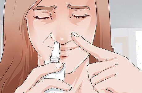 Squirt in a saline spray. Remove the cap. Insert the nozzle into one of your clogged nasal passages. Squeeze in one or two drops while simultaneously clamping shut the other nostril. Inhale deeply. Release the clamped nostril. Follow the instructions on the label to be more precise. Saline or salt water sprays are simple over-the-counter nasal rinses that can thin mucus, relieve postnasal drip, and moisten dry nasal passages. These sprays also have some benefits for removing viruses and bacteria from the nose. They are not medicated so are usually very safe for adults and even kids.