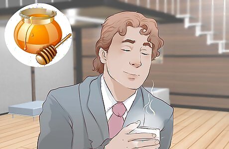 Mix in honey with a drink. You can try this for a throat remedy. Honey is a good soothing substance for a sore throat and cough. Mix in a teaspoon with some hot tea for a beverage. This can be done at home or work. You may want to prepare the mix at home and put the drink in an insulated thermos to take to work.