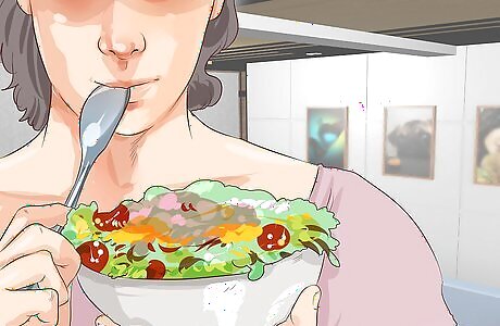 Eat lighter but maintain your strength. Prepare foods to improve your immune system. Take a can of soup, vitamin c rich fruits (like oranges), and some proteins (lean meats, poultry, eggs) that you can stomach in meal containers with you to work. The flu or illness you have may upset your stomach and the medicine you take may aggravate this feeling further. However, you need to keep up your nutrients to help your recovery. Soup is good for eating especially if it's hard to swallow without pain. Eat hot chicken soup. You can sprinkle in pepper, add garlic, add curry powder, or put in a dash of other pungent spices to thin out the mucus congesting you. The soup can also improve your white blood count in your immune system. Drink orange juice to build up your vitamin C and folic acid for your immune system. Dairy is okay unless it’s upsetting your stomach. Keep on eating good protein sources like lean meats, poultry, fish, legumes, dairy, eggs, nuts, and seeds. These have vitamins B6 and B12 which help your immune system. Selenium and zinc also help your immune system. These minerals are found in protein-rich foods too. Other immune system boosters include grapefruits, lemons, limes, watermelon, kale, collard greens, broccoli, and cabbage.