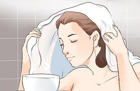 Use aromatic steam. Breathing in aromatic steam can help relieve nasal congestion by thinning mucus and it can also relieve sinus pressure and headache symptoms.< You can do this at at home or in your workplace’s restroom if time permits. Add a couple of teaspoons of ginger, one teaspoon of menthol ointment (over-the-counter), or several drops of eucalyptus oil. Go to a sink with water warm enough to form steam and fill the sink with hot water. You’ll also need a towel, so have one handy. Drape the towel over the back of your head so the ends drop around either side of your head. Breathe in the steam for a few minutes.