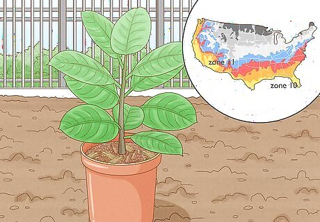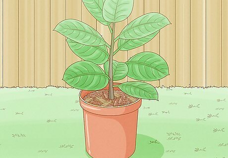 Pick a protected location for outdoor trees. Rubber trees need to be protected from the wind. Place it near a wall to protect it. For the most protection, determine the direction the wind in your area commonly blows, and place it so it is blocked from that wind. For instance, in the southern areas of the US, the wind typically blows from the south or west, so place the tree on the north or east side of the building.