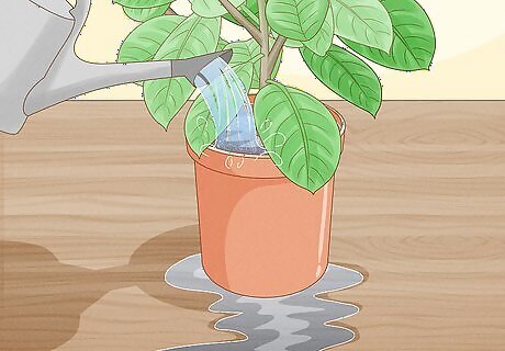 Provide enough water that it runs out of the bottom. If you're soil drains well enough, you don't have to worry about over watering the plant in one watering session. To make sure your plant gets enough water for its roots, add enough that it seeps out of the bottom into the drip tray or base. Outside, give the plant a good 5-minute soaking if conditions have been dry and the leaves are drooping.