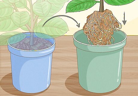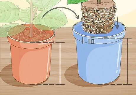 Re-pot indoor plants once a year when they are young. Summer is the best time to re-pot this plant. Pick a pot that's about 1 inch (2.5 cm) bigger in diameter than the current pot. For the first couple of years, re-pot the plant once a year. After that, you can replant every 3 years or when it becomes root bound. To re-pot the plant, add soil to the bottom of the new pot. Grasp the plant by the stem, and pull it out of the old pot, roots, soil, and all. Set it in the new pot. Surround it with soil until you reach the top edge of the soil from the old pot. Give the plant some water.