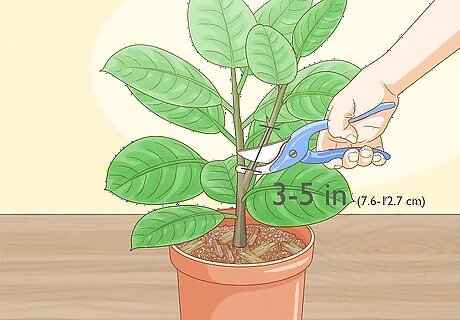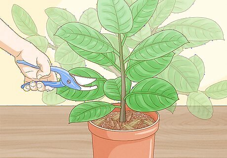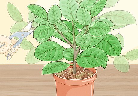 Prune to create the shape you want indoors. If your rubber plant is at the height you like, use hedge shears to cut off the top of the plant. It will then branch out instead of growing up. You can also trim off branches to create a shape you like. When these plants are pruned, they'll drip sap, so put something down to protect your floors. The sap can also irritate your skin, so avoid it or wear gloves. These plants can grow to 10 to 12 feet (3.0 to 3.7 m) indoors, so make sure you trim it when you want it to stop growing. You can also prune outdoor trees this way to help keep them an acceptable height. It's best prune during the spring and summer, but you can do it anytime of year. You can prune off dead or dying leaves as they appear on the plant.